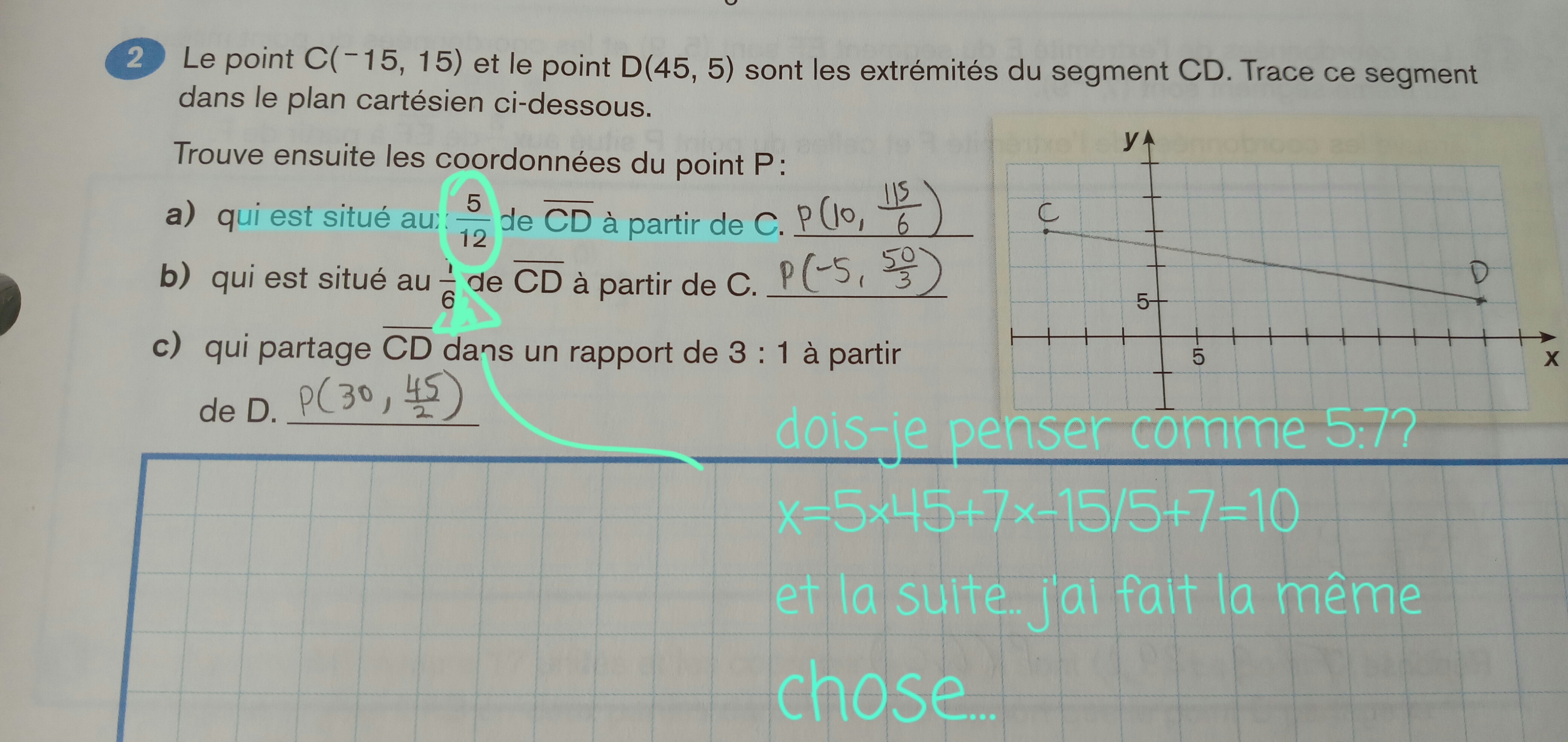 Pour trouver le point qui est au 5/12 de CD à partir de C, on trouve d'abord la valeur de CD :