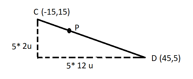 $$ m\overline{CD} =\:D(45, 5) -\:C(-15, 15) = (45 - (-15), 5 - 15) $$