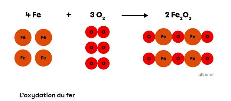 Dans cette réaction, le fer est oxydé, il perd des électrons (qu'il donne à l'oxygène). Le fer perd ses électrons pour devenir du Fe3+ et l'oxygène du O2-. Lorsque ces ions sont formés, ils se combinent pour former de la rouille.