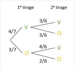 En ce qui concerne l'arbre de probabilités, dans celui-ci, tous les chemins partant de la racine et arrivant à une feuille représentent des évènements disjoints. Tu t'arrêteras après avoir fait tous les événements élémentaires ou issus du 2ème tirage qui est à la 2ème colonne.