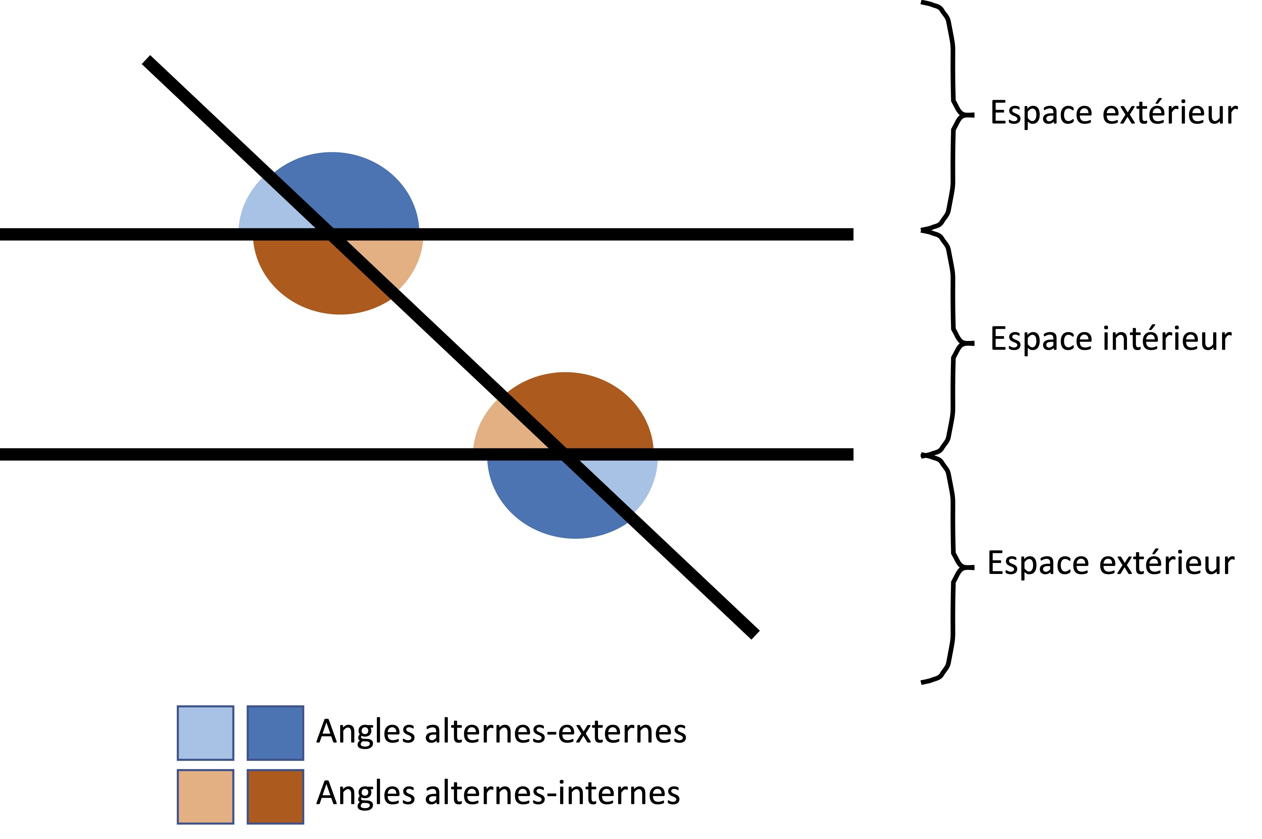Cependant, tandis que les angles alternes-internes se trouvent à l'intérieur des droites parallèles, les angles alternes-externes se situent à l'extérieur de celles-ci. C'est pourquoi on les désigne respectivement ainsi : les angles alternes-internes (interne signifiant à l'intérieur des deux droites parallèles) et les angles alternes-externes (externe indiquant à l'extérieur des deux droites parallèles).