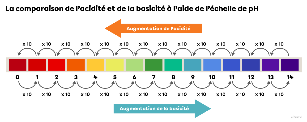 Par exemple, la diminution d’une unité sur l’échelle de pH signifie que l’acidité est multipliée par 10. L’augmentation d’une unité sur l’échelle de pH signifie plutôt que la basicité est multipliée par 10.
