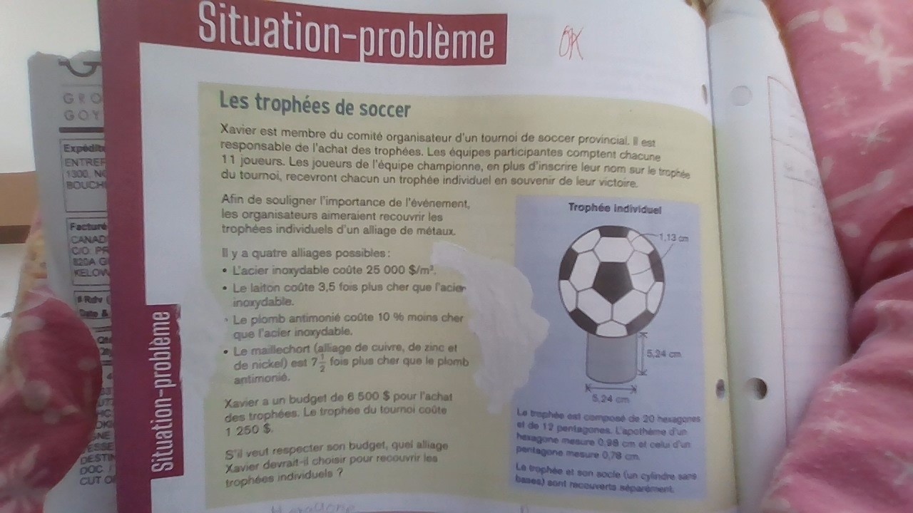 Une fois que tu auras l'aire d'un trophée, tu devras déterminer l'alliage qui permet de respecter le budget de 5250$ pour les 11 trophées individuels :