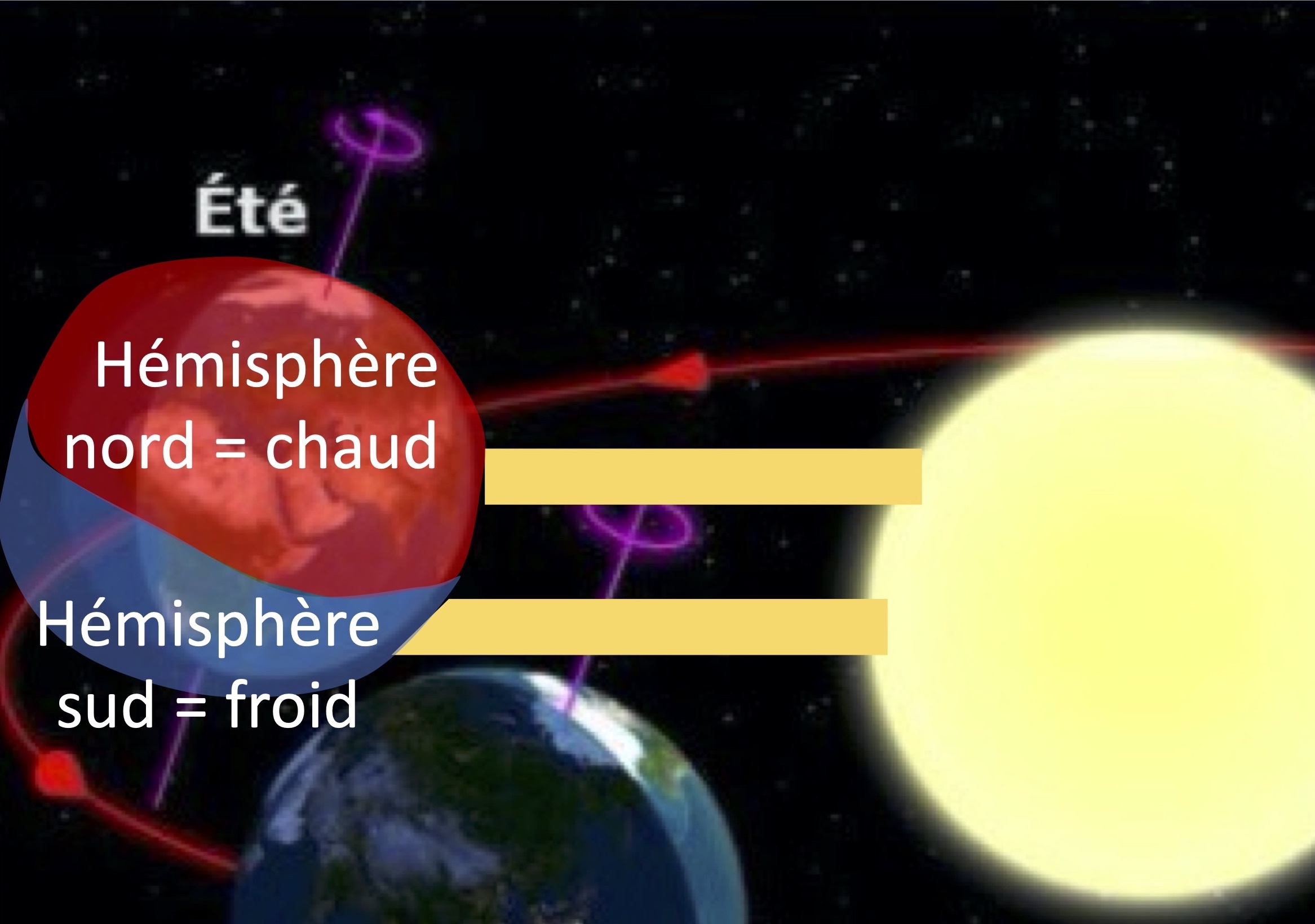 Comme tu vois, lors de l'été l'hémisphère nord reçoit plus de rayons (représentés par les barres jaunes) qui sont concentrés sur une plus petite surface, alors que l'hémisphère sud reçoit moins de rayons qui sont répartis sur une plus grande surface.