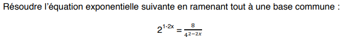 Une fois que c'est fait, lorsque la base est la même des deux côtés tu peux écrire une équation à partir des expressions mises en exposant.
