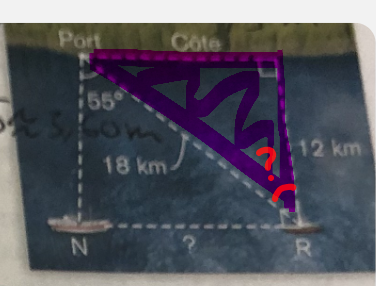 Premièrement, au premier problème, il y a un triangle à angle droit formé par le port, la côte et le remorqueur.
