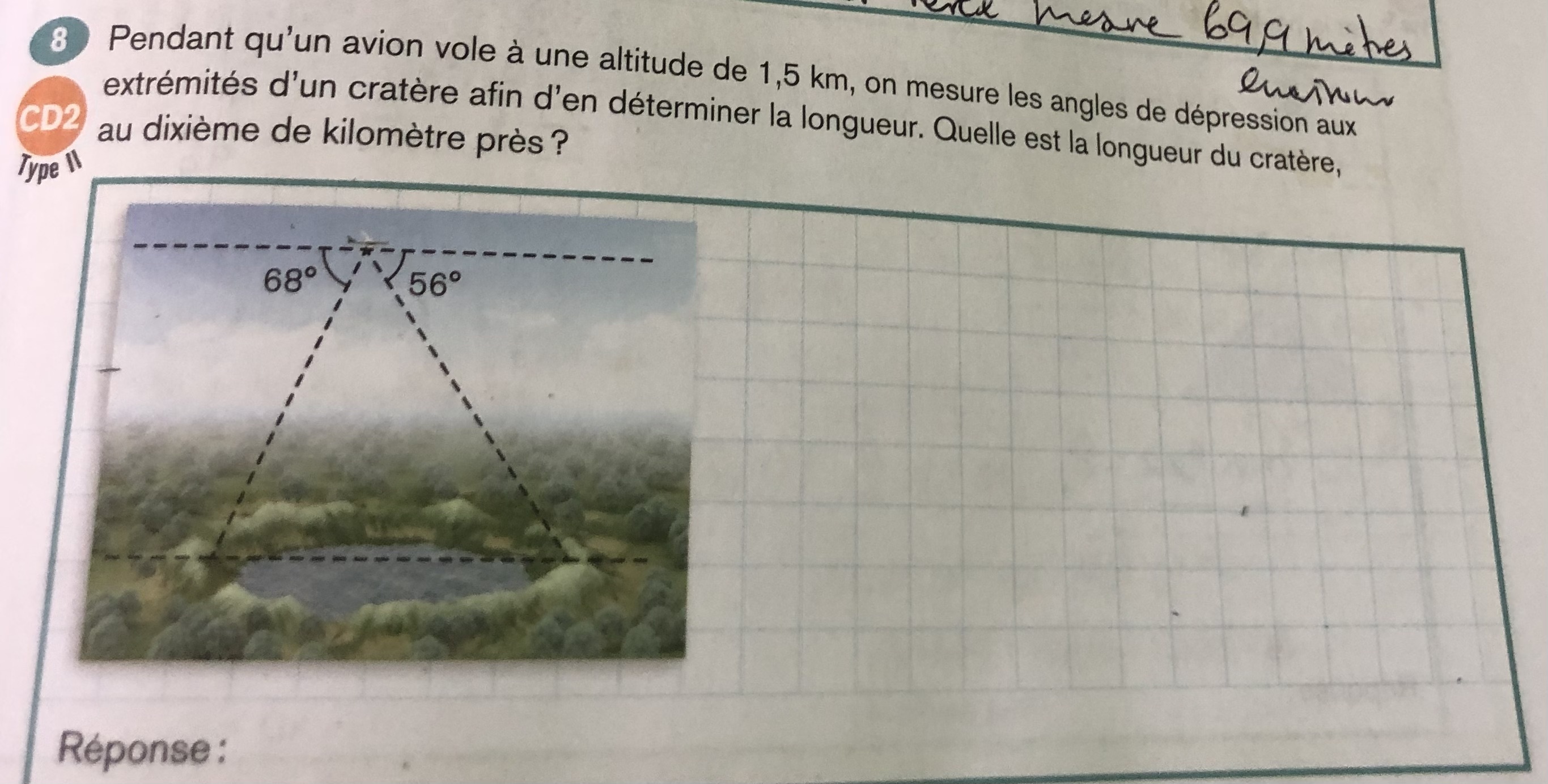Ensuite, pour le deuxième problème, commence par tracer la hauteur du triangle, qui représente l'altitude de l'avion. Par rapport à cette hauteur, il y aura deux triangles à angle droit.