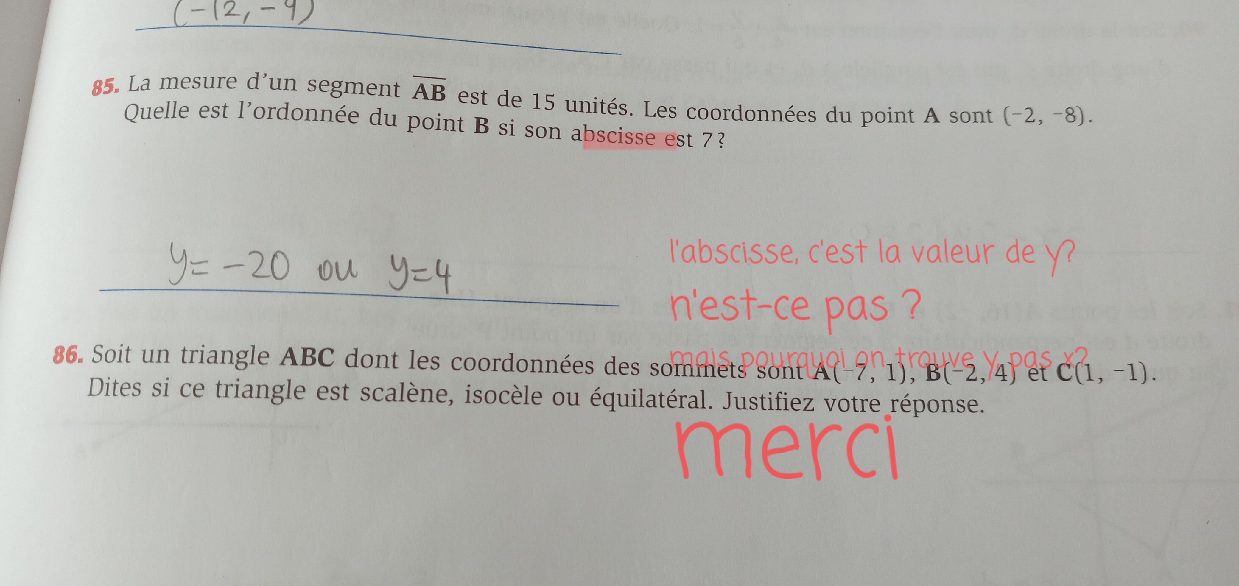 L’abscisse, c’est la valeur de x, tandis que l’ordonnée, c’est la valeur de y. Dans l’énoncé du problème, on te fournit déjà l’abscisse du point B, soit x=7. Tu dois maintenant trouver son ordonnée, donc son y. Pour cela, tu auras besoin de la formule permettant de trouver la distance entre deux points.
