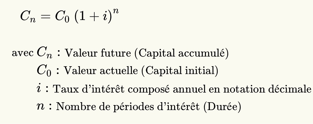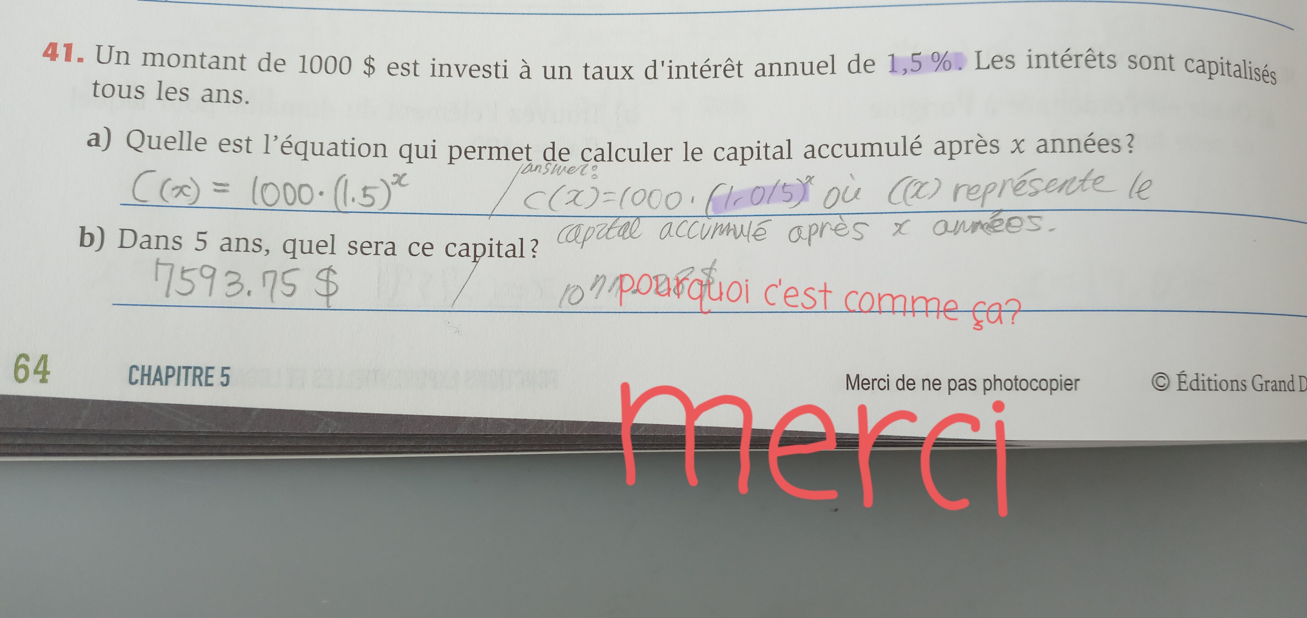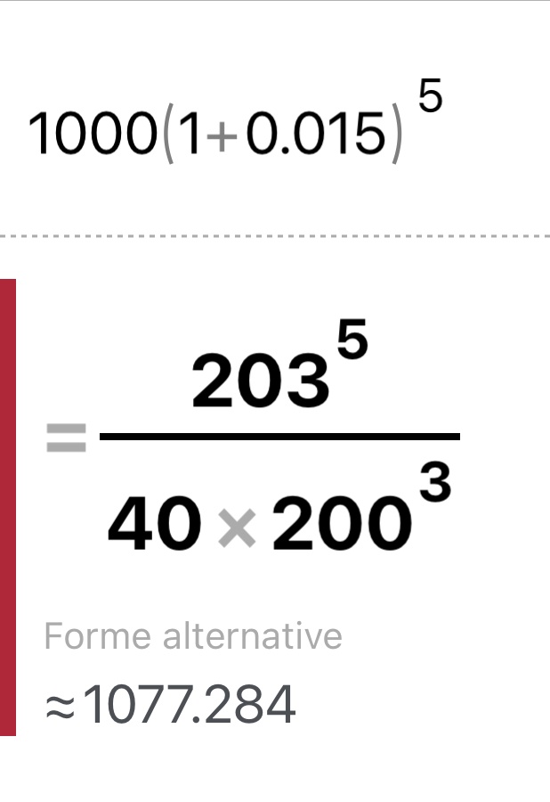 Le taux d’intérêt est de 1,5%. Cependant, il doit être écrit en notation décimale dans l’équation. Donc, i=0,015 et non 1,5.