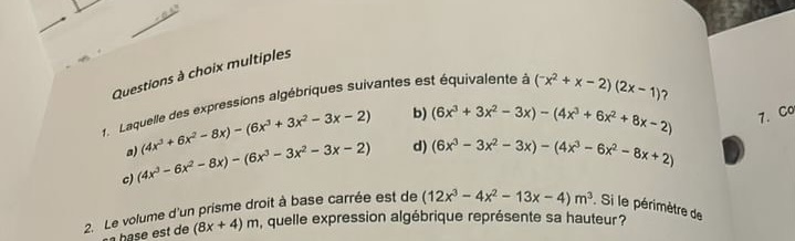 Tu dois réduire les expressions algébriques dans les choix de réponse, et vérifier lequel correspond à l'expression demandée.