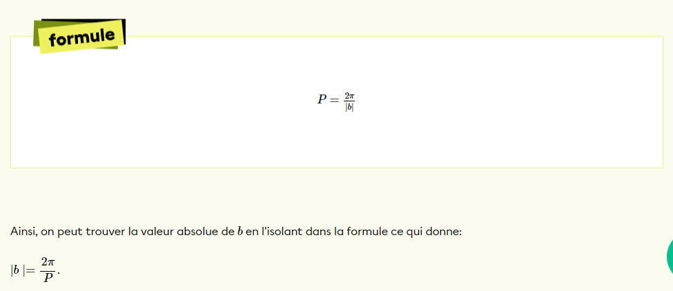 Ensuite, le paramètre b s'obtient à partir de la période, c'est-à -dire la durée d'une rotation de la roue. Tu peux trouver cette information dans l'énoncé de problème. Voici la formule pour ce paramètre :
