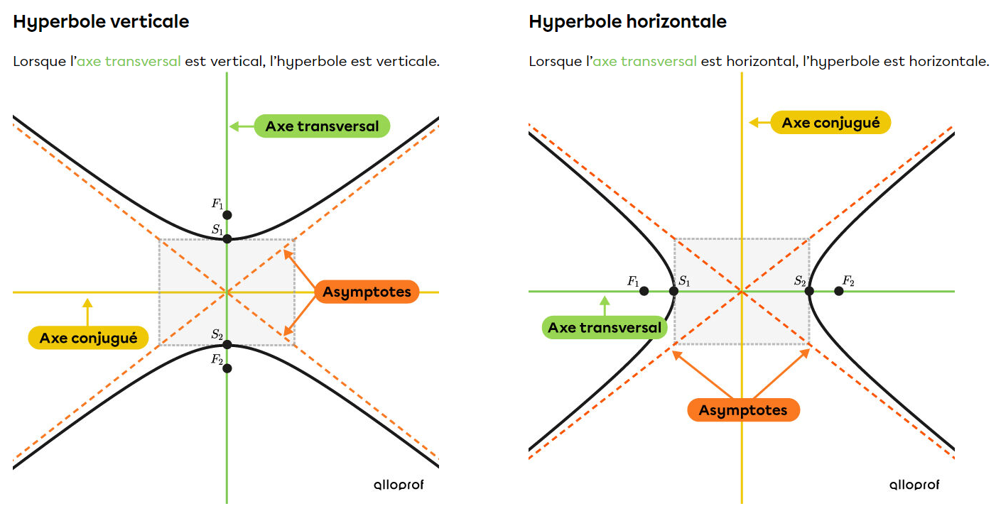 Pour les hyperboles horizontales, le sommet et le foyer ont la même ordonnée (le même y), mais des abscisses différentes.