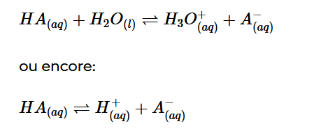 Pour ce qui est de la constante d'acidité, la plupart des acides sont des acides faibles qui peuvent atteindre l'état d'équilibre en solution aqueuse. À l'équilibre, les molécules de l'acide se dissocient à la même vitesse que les ions formés se recombinent pour reformer les molécules de l'acide. On peut généraliser cette réaction de la façon suivante.