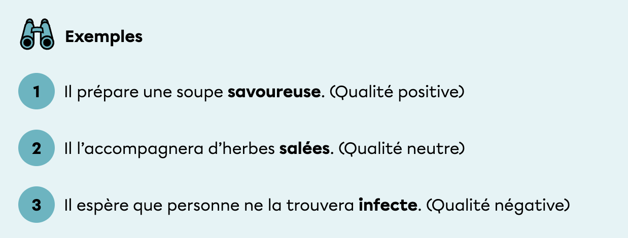 L'adjectif qualifiant donne une qualité à un nom. Elle peut être positive, neutre ou négative: