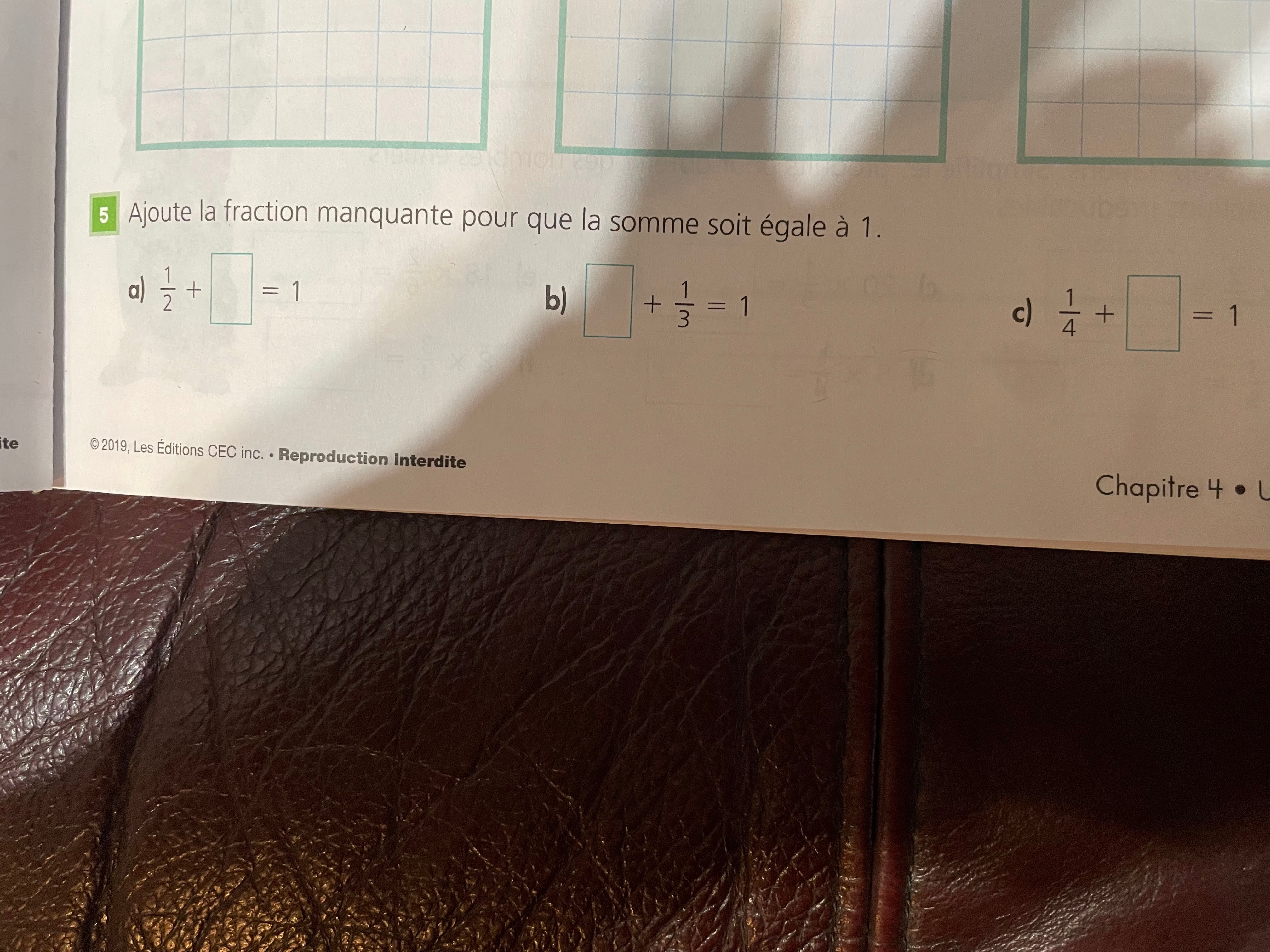Pour trouver la réponse, tu dois faire l'opération inverse. Par exemple, si tu dois trouver l'encadré dans la question 5a), tu dois te demander 1/2 + quoi = 1. Pour trouver la réponse, tu peux faire l'opération 1 - 1/2 = quoi?