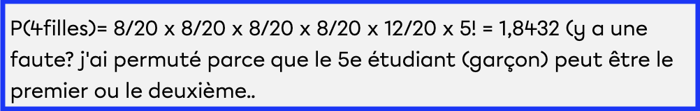 P(4filles)= 8/20 x 8/20 x 8/20 x 8/20 x 12/20 x 5! = 1,8432 (y a une faute? j'ai permuté parce que le 5e étudiant (garçon) peut être le premier ou le deuxième..