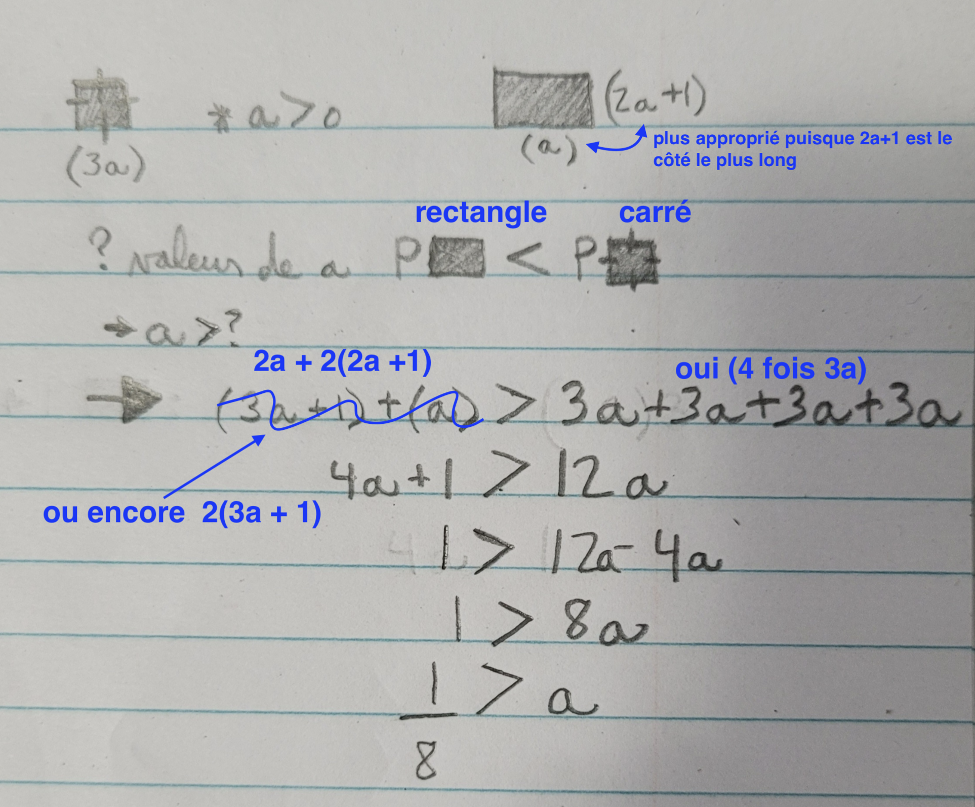 Pour le rectangle , je t'invite à recalculer le périmètre total, tu as fais une erreur dans ton équation. Le périmètre du rectangle serait ; a + (2a+1) +a + (2a+1)