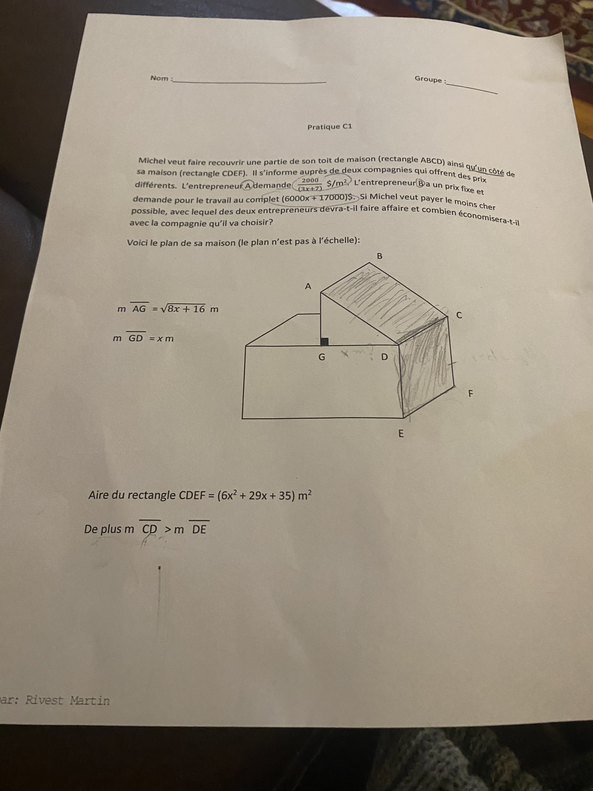 De plus, on te donne l'aire du rectangle CDEF, factorise l'expression afin d'obtenir deux facteurs qui seront la longueur et la largeur du rectangle. Sachant que la mesure du segment CD est plus grande que celle de DE, tu pourras alors associer le bon facteur au bon segment.