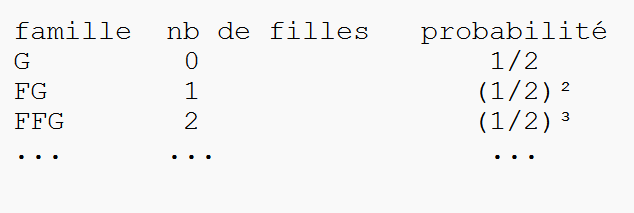 Pour chaque famille l'expérience consiste en une série d'essais (donnant deux résultats possibles: naissance d'une fille ou d'un garçon) qui se conclue lorsque le premier garçon naît.