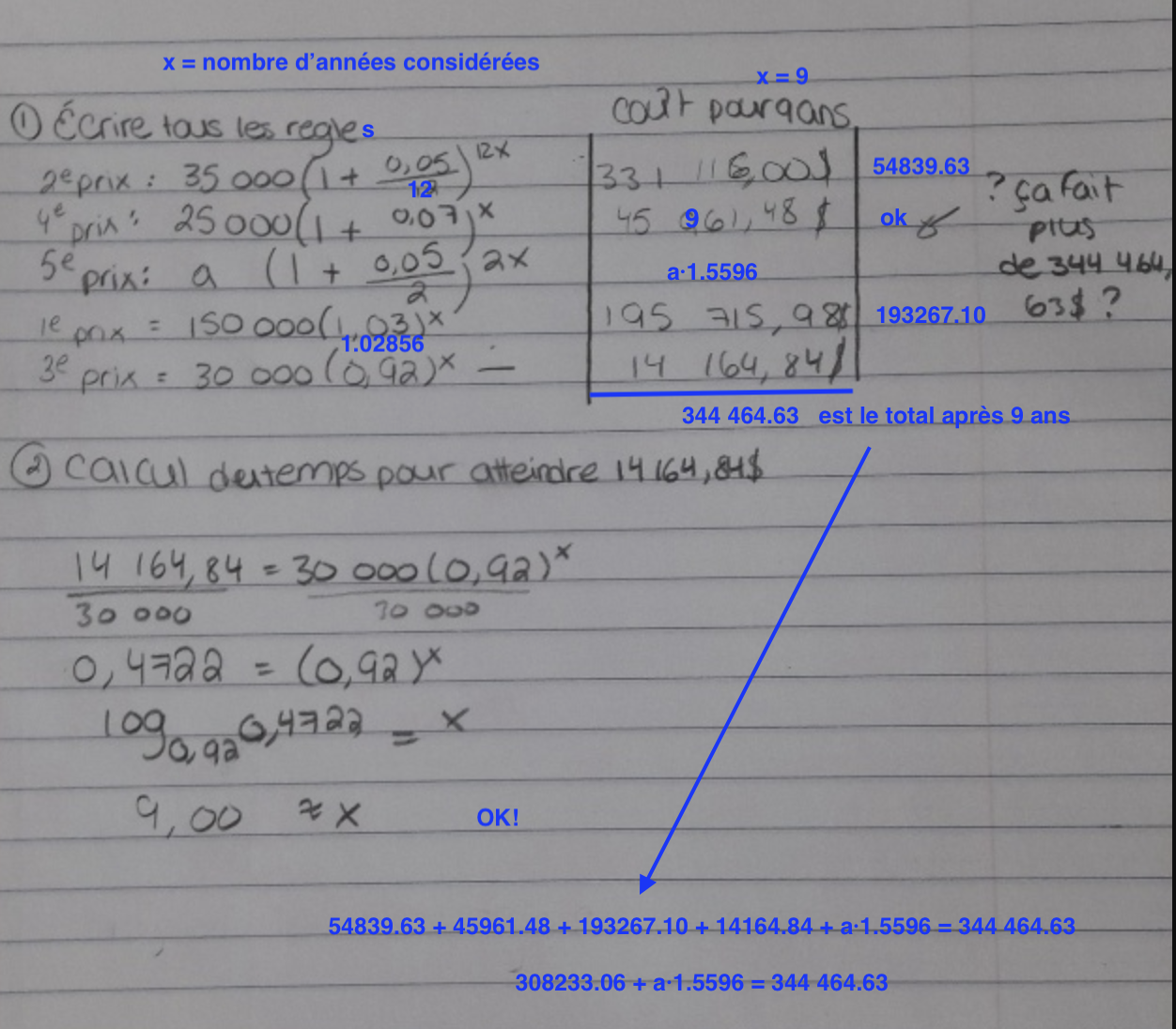 Des erreurs de calculs (écriture?) plus que de raisonnement, cependant pour déterminer le montant il faut que tu exprimes ton inconnue (a) en fonction de tes autres valeurs.