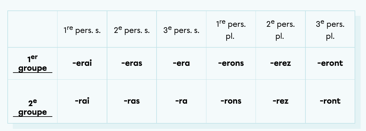 Voici les terminaisons des verbes au futur simple :