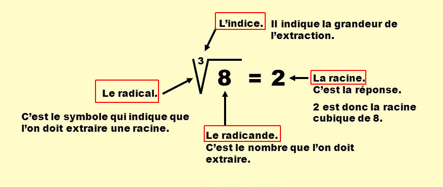 Lorsqu'on parle de racine, il y a le radicance, l'indice et la racine. Mais je ne me souviens plus du nom du symbole √!