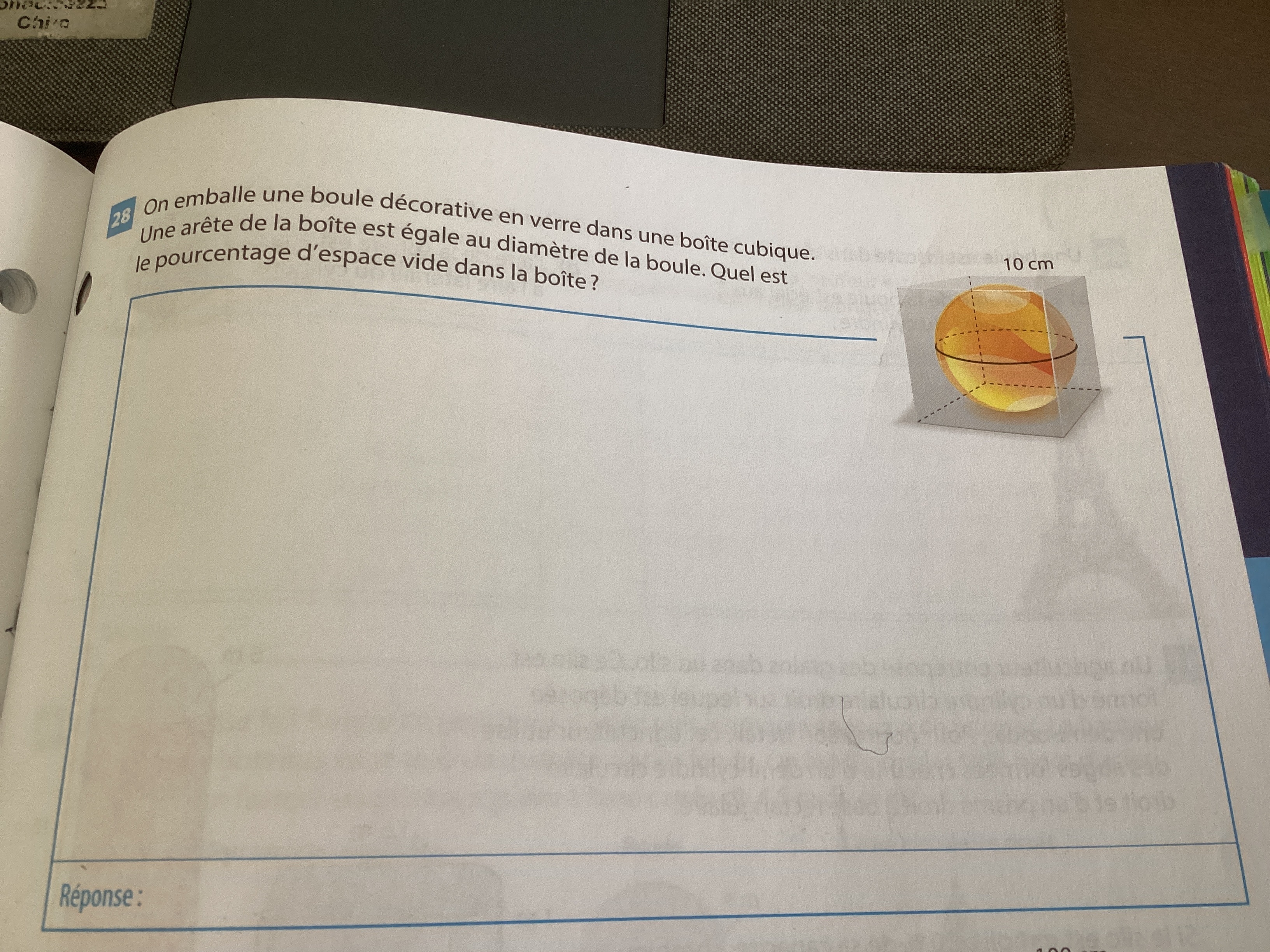 Bonjour, on te dit qu' un côté du cube est egale au diamètre de la boule. A partir du diamètre tu peut trouver le rayon car le rayon vaut la moitier du diametre. Ensuite tu pourra calculer le volume de la boule v=4πr³/3 et tu pourra aussi calculer le volume du cube c³. Ensuite, pour trouver le volume de l'espace vide dans le cube, tu dois soustraire le volume du cube par la volume de la boule. Cela te donnera 476.4cm³. Pour trouver le pourcentage d'espace vide dans le cube il faut effectuer se calcul : volume espace vide dans le cube ÷ par volume totale du cube ×100 . La reponce va être 47,64%. J'espère que ca aide :)
