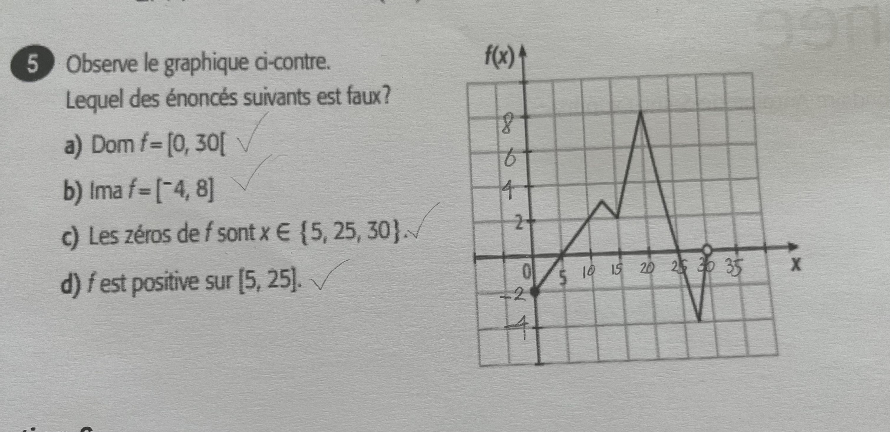 Tu as un point ouvert à x=30, donc x=30 ne fait pas partie de ta fonction f. Je te laisse trouver la réponse avec cet indice ;)