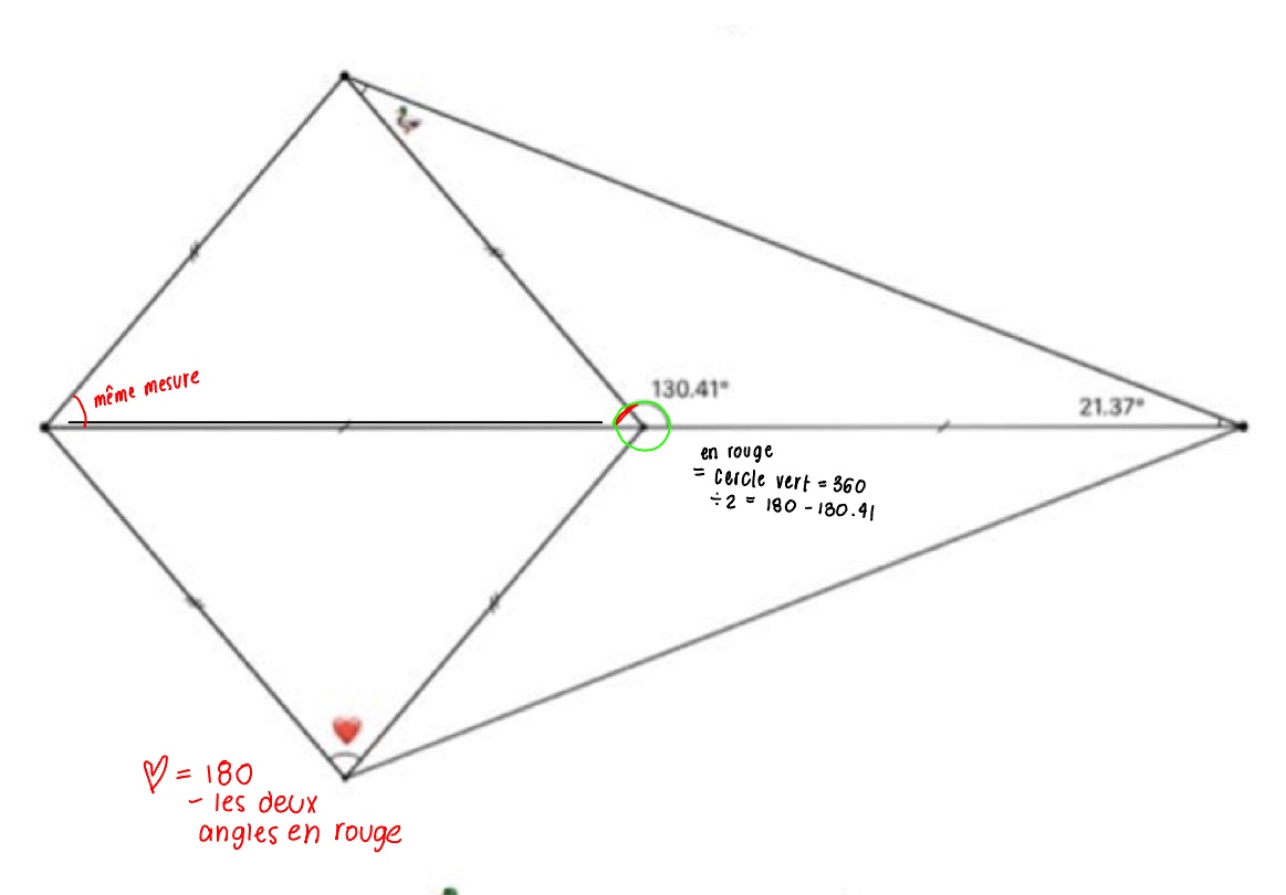 Allo! L’angle de 130, 41 est sur une ligne droite donc d’après moi vue que un cercle complet est 360 degrés et que la ligne représente la moitié de ce 360 la le calcul que que doit fait pour avoir l’angle juste à côté est 360 diviser par deux ce qui donne 180 et 180 moin 130.41 qui va de donner ton angle vue que l’angle oppose est pareil il va avoir le même angle et après tu fait 180 moin t’es deux angle et t’a l’angle du cœur. Les angles en rouges sont pareil dans les deux triangles à cause des barres parallèles qui veut dire que t’es mesures sont équivalentes.