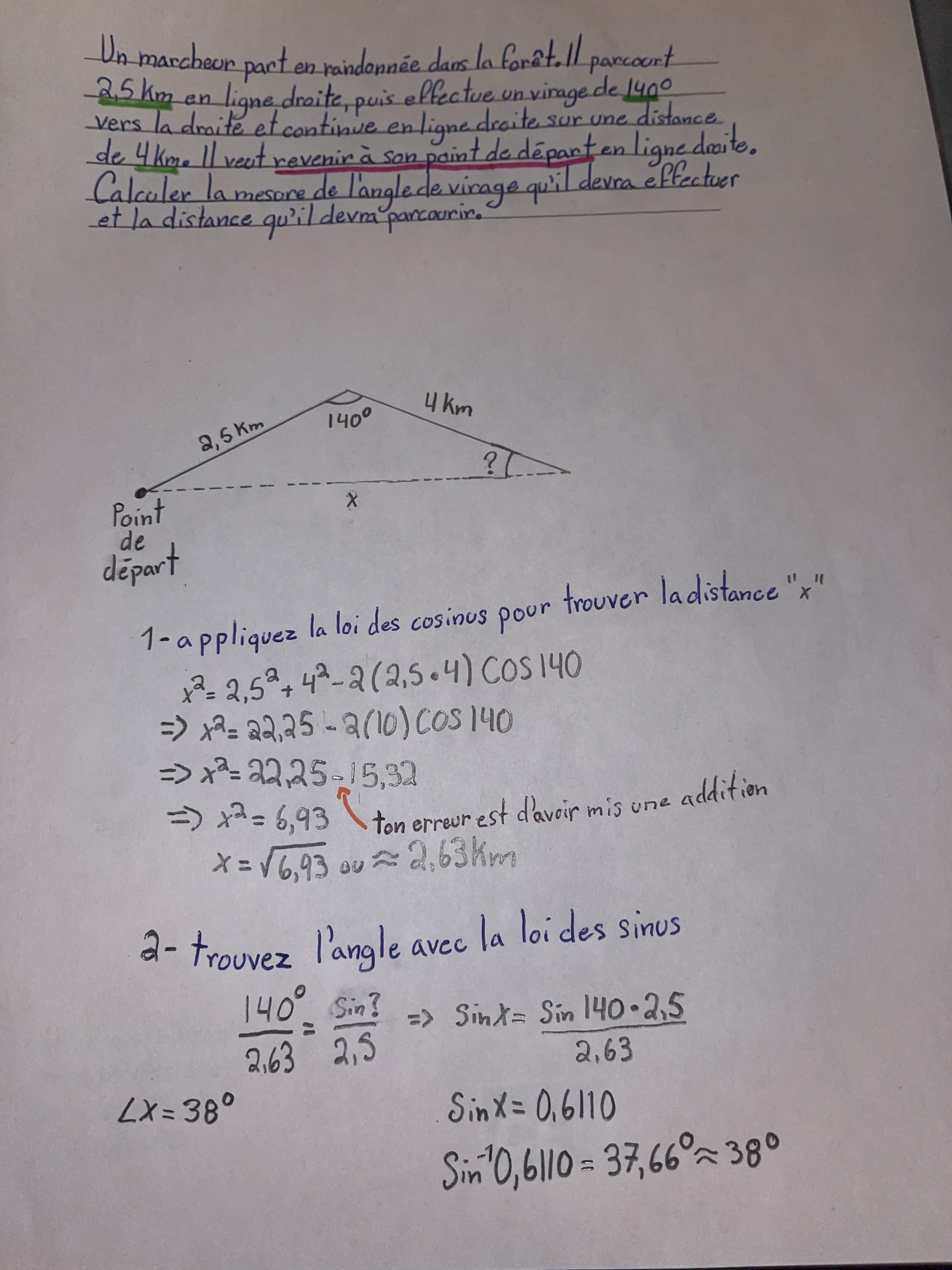 J’ai commencé à faire ce problème, mais la réponse que j’ai trouvé ne correspond pas à celle du corrigé. Pouvez vous m’aider? Dans le deuxième partie de la question, faut il chercher mesure de l’angle A ou C?