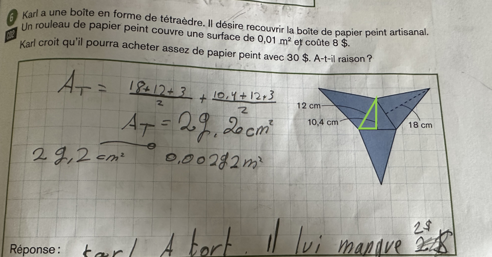 De plus, tu dois trouver l'aire, et non le périmètre. L'aire d'un triangle est bh/2. Tu en as un au milieu et trois de même aire autour.