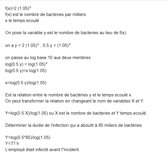 par contre pour savoir le temps x qui correspond à une infection de 85 milliers de bactéries alors oui tu dois utiliser la fonction inverse avec le logarithme en base 1.05