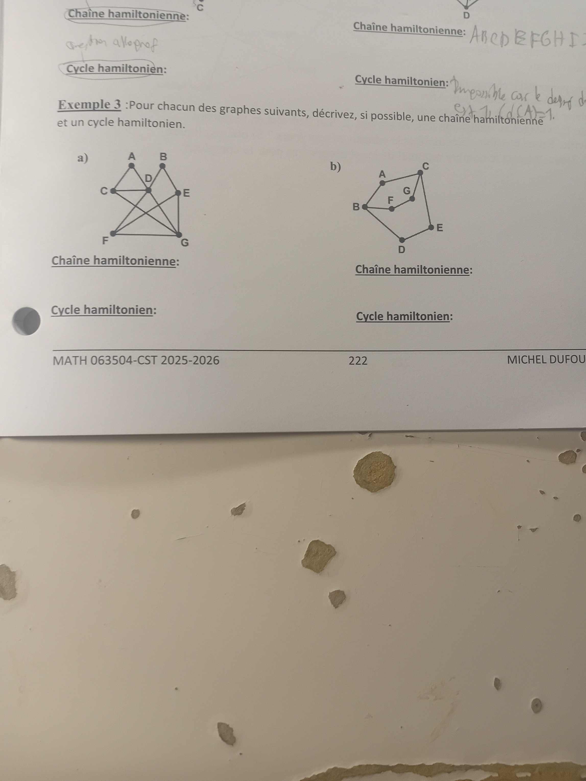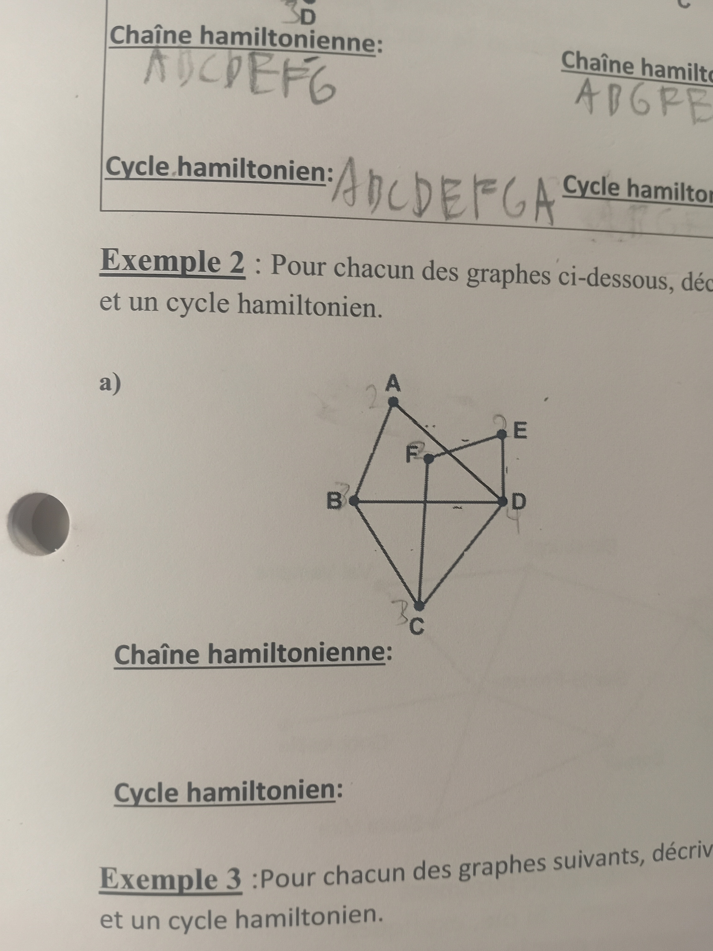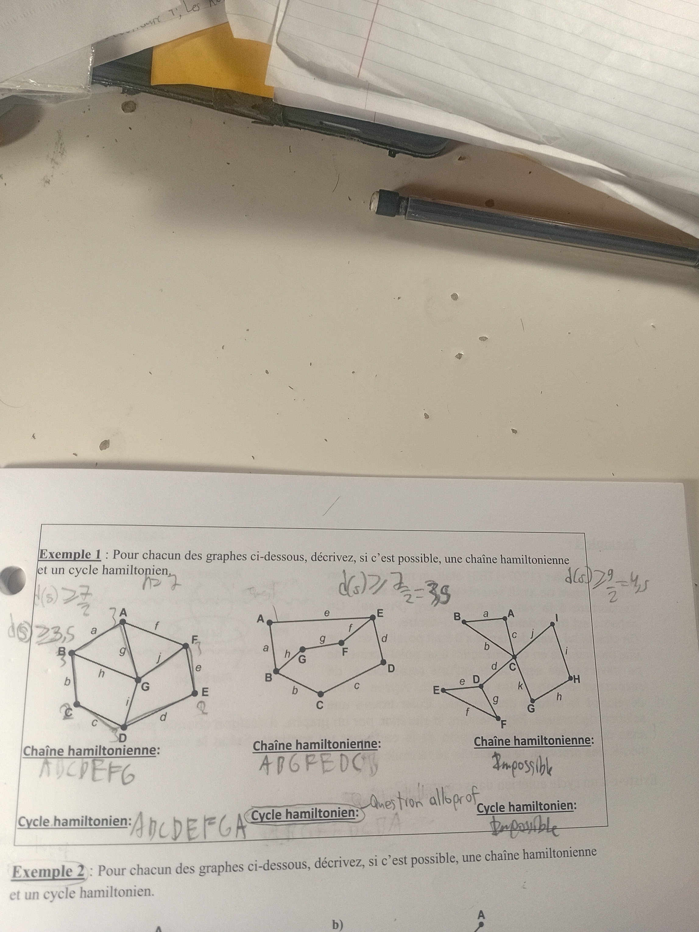 On est d'accord pour le a) que le cycle hamiltonien est impossible et même pour le b) aussi. Merci Exemple 3