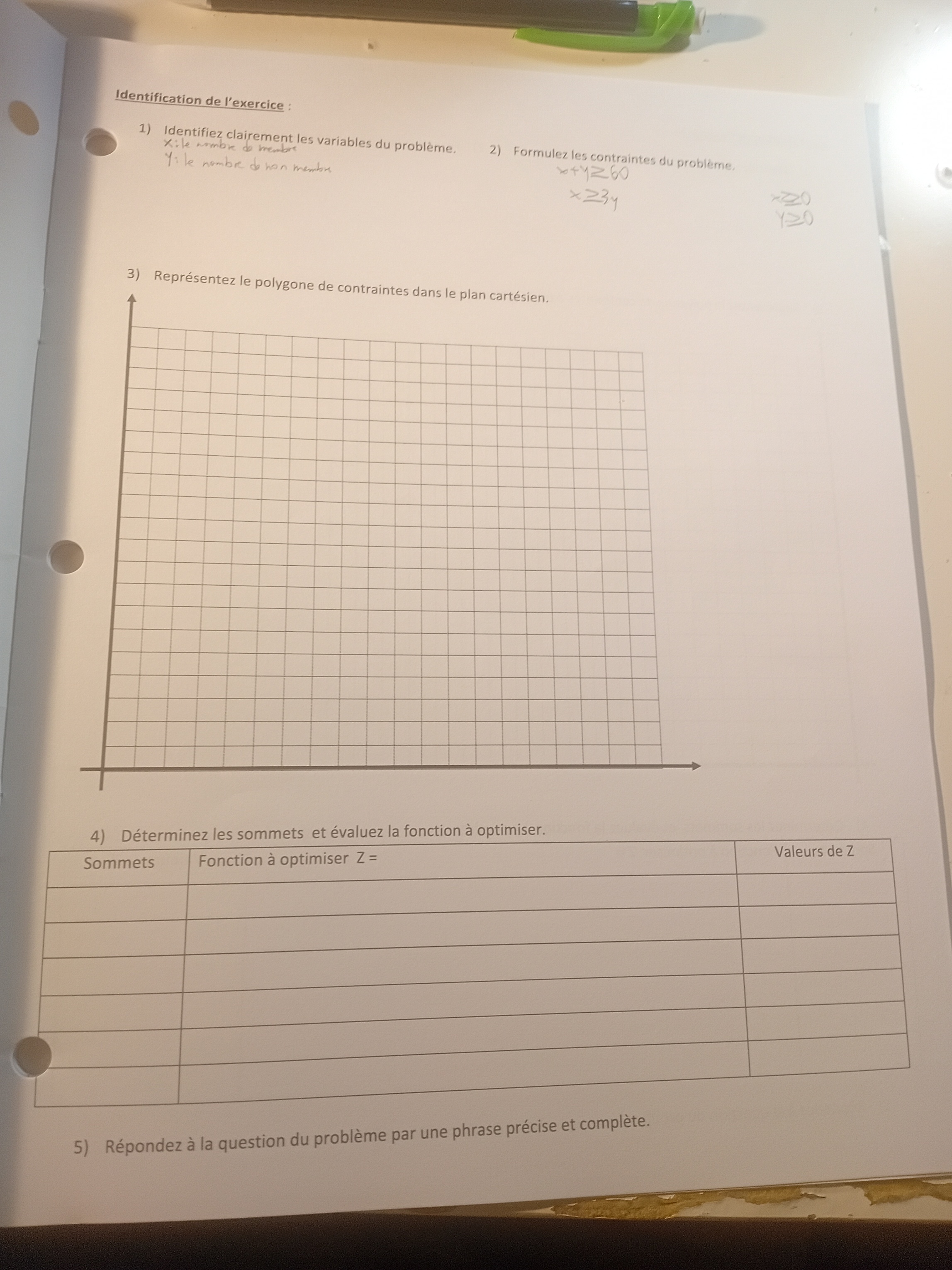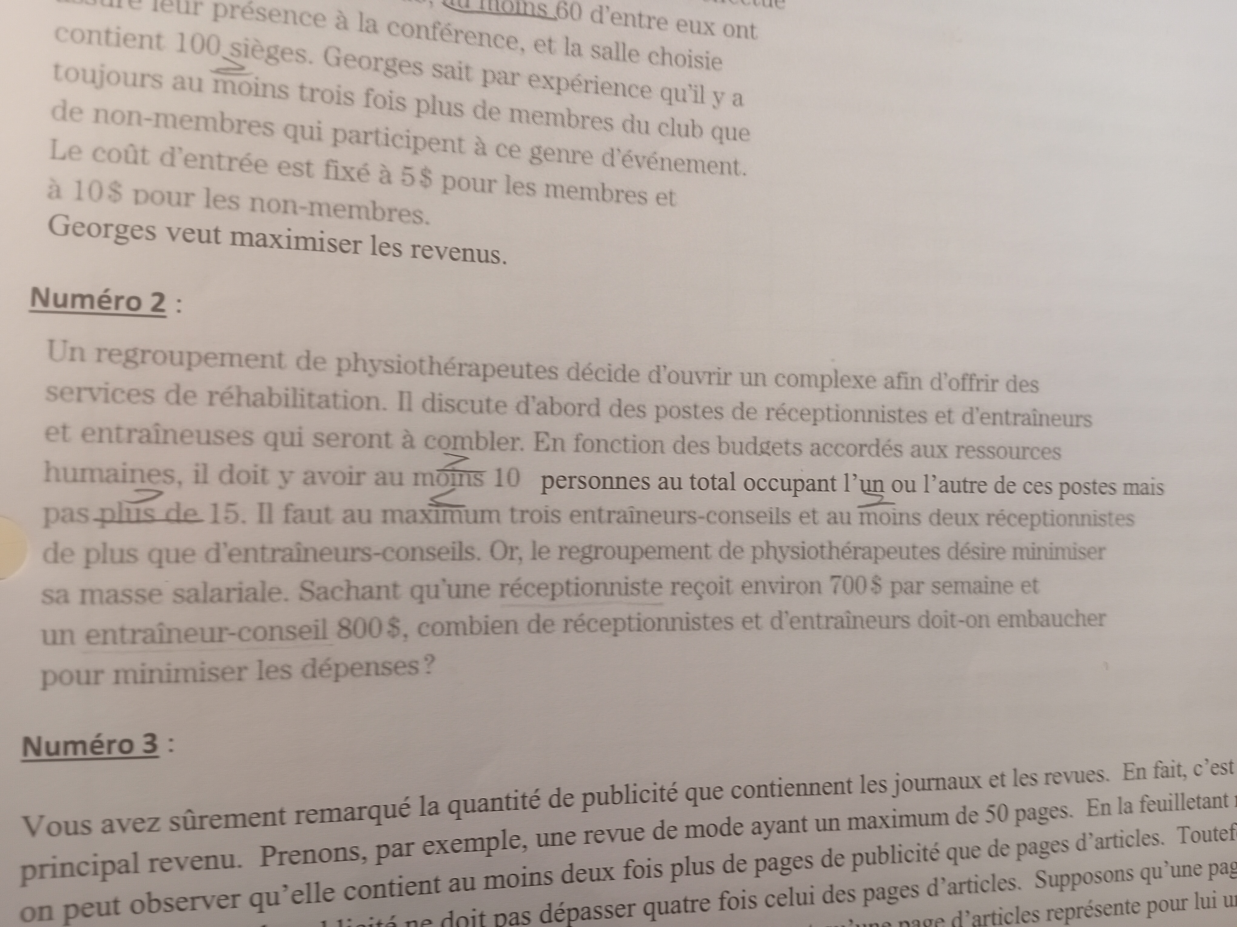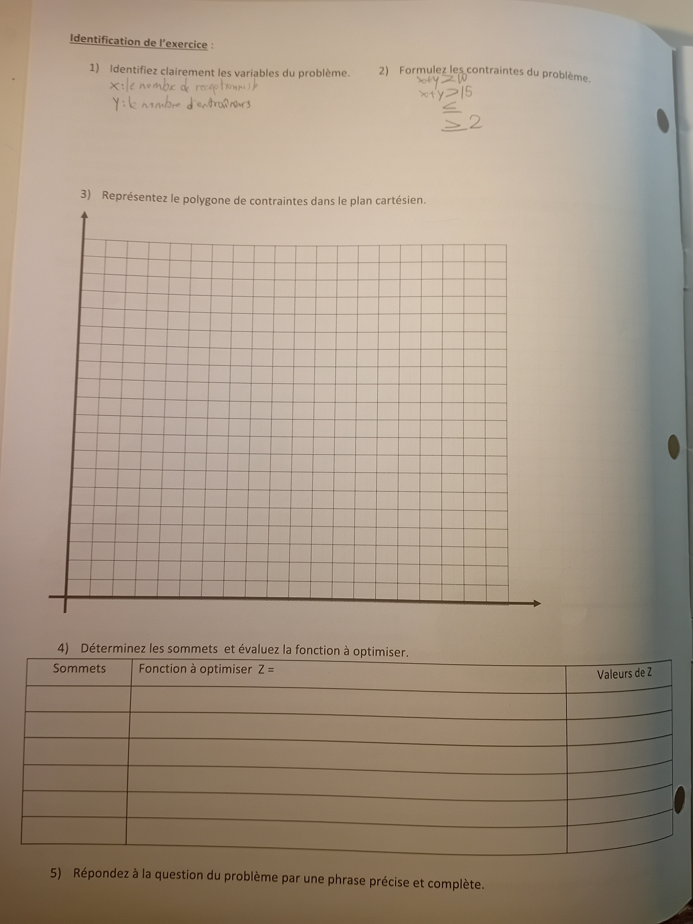 2) Est ce qu'au mot réceptionniste je dois mettre un variable, je sais que je dois mettre une variable y aux entraîneurs conseils parce qu'on ne dit pas combien il y a mais le problème avec le mot réceptionniste j'hésite de mettre la variable parce que ça serait étrange de mettre une variable puisqu'on ne multiplie pas mais la on ne multiplie pas donc je ne suis pas sur s'il faut que je met la variable x au réceptionniste. On met une variable quand il s'agit d'une multiplication.