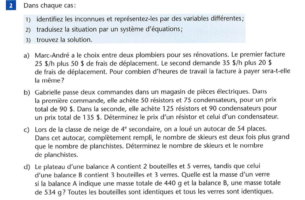 Secondaire 4 • 1mBonjour, je suis en math TS de sec 4 et nous sommes dans la partie des système d'équation. Dans la question plus bas je n'ai pas compris le numéro c, plus précisément comment trouver ça solution a partir des équation x+y=54 et x=2y. Je me demandais si quelqu'un pourrait m'aider svp!