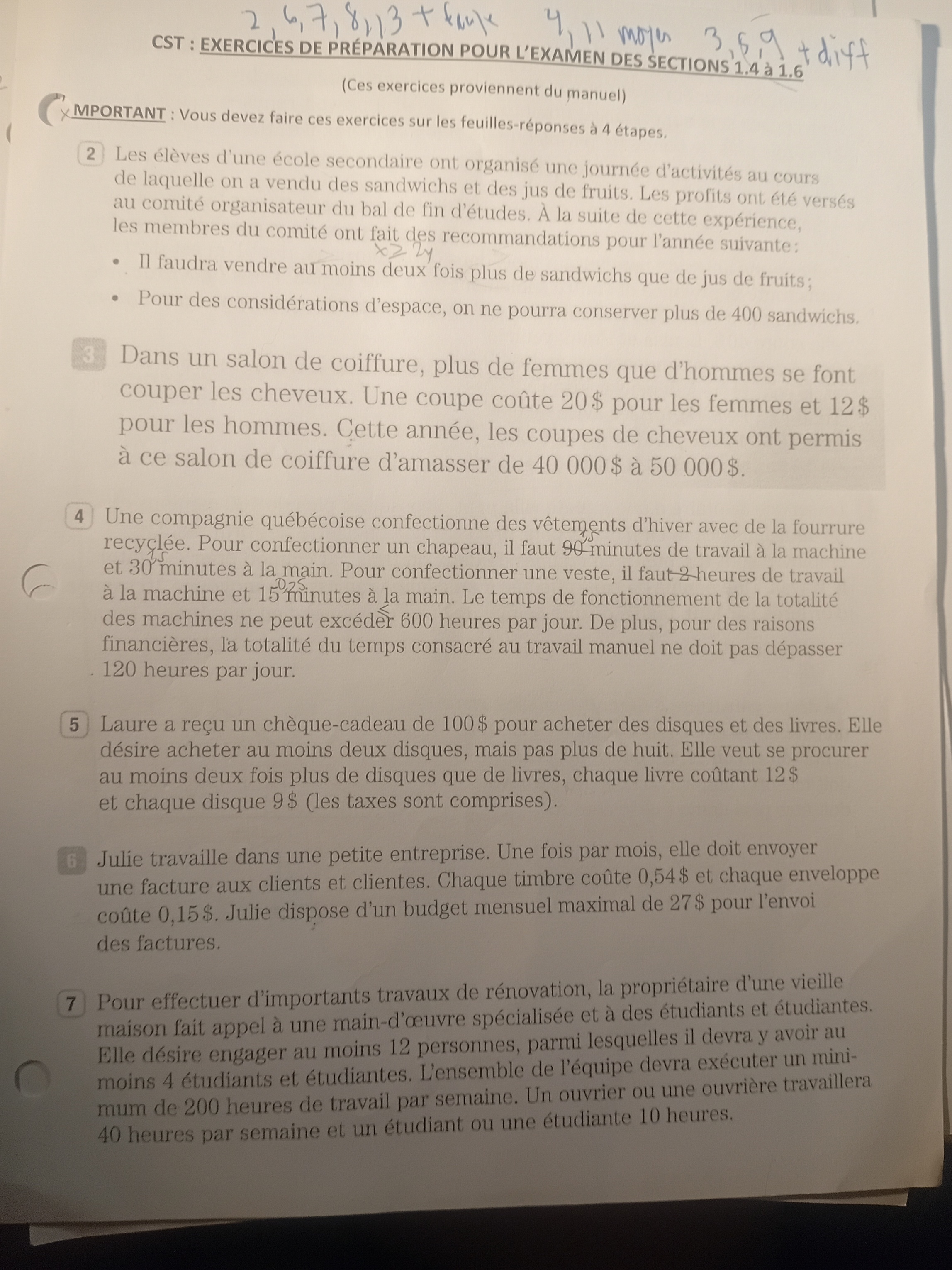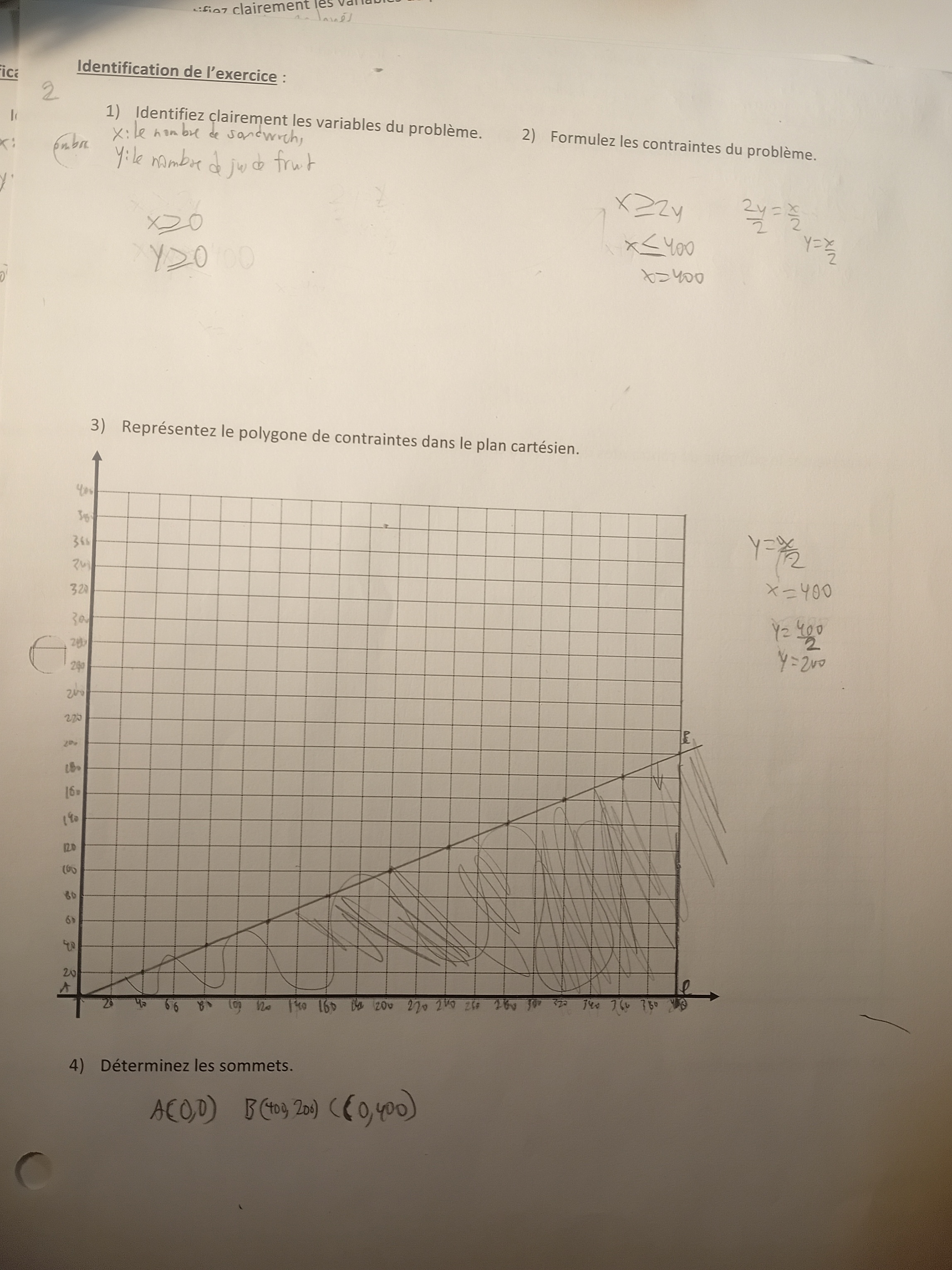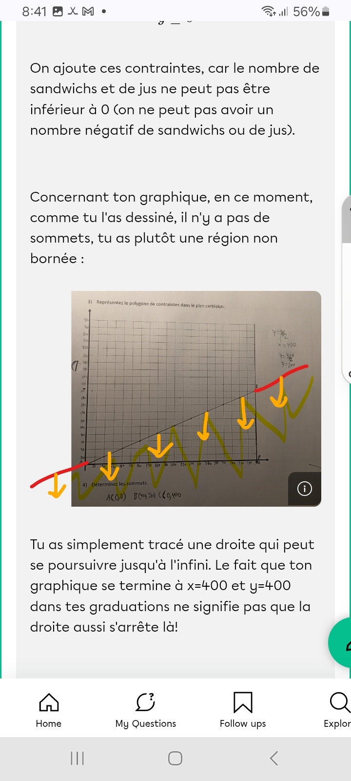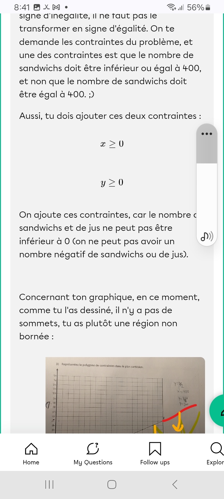 Secondaire 5 • 1mJe parlais du y_>0 et x_>0 et je n'ai jamais parlé de ça: il est dit que le nombre de sandwichs doit être inférieur ou égale à 400 et c'est pas ça le problème. Regardez ma question que j'avais ecrit. Donc si je vais me stresse encore. Je ne sais ce que vous ne comprenez pas s'il vous plaît mais ma question est très simple. Votre collègue katia m'a dit que j'ai oublié de mettre le x_>0 et y_>0 donc elle a mis l'équation x plus grand égal à 0 et y plus grand égal à 0. J'ai compris pourquoi on met le signe toujours plus grand pour une bonne raison mais ma question est simple. Comment votre collègue katia a-t-elle su qu'il fallait mettre le x plus grand égal à 0 et y plus grand égal à 0 et non x plus grand sans égal à 0 et y plus grand sans égal à 0.